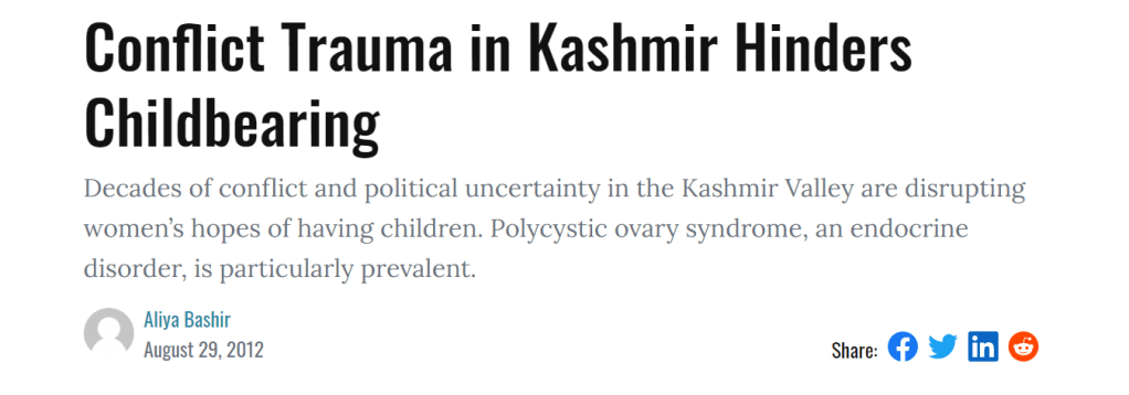 A 2006 study by Doctors Without Borders, “Prevalence of PTSD in Conflict-Hit Kashmir,” attributed the high rate of miscarriages among women in the area to post-traumatic stress disorder, an anxiety disorder caused by a shocking and upsetting event.