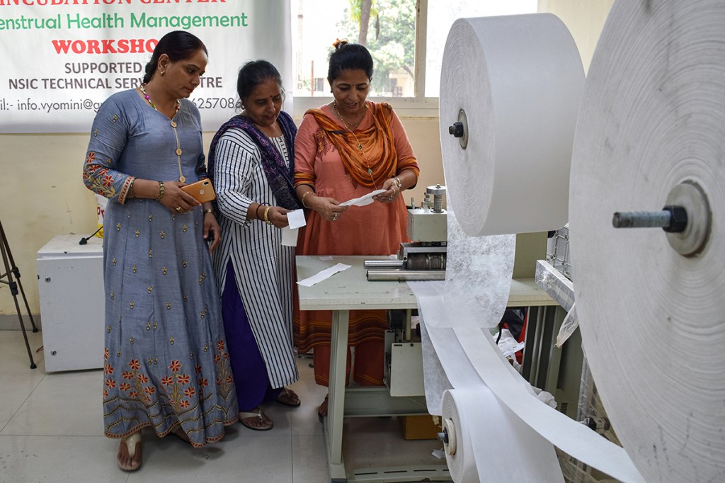 Kaushik’s own enterprise, Vyomini, trains women entrepreneurs in rural areas to manufacture and pads made from organic raw material. The pads are sold under the brand Rakshak, which means “protector” in Hindi. They cost from 55 Indian rupees to 135 Indian rupees (77 cents to $1.88), depending on size and thickness.